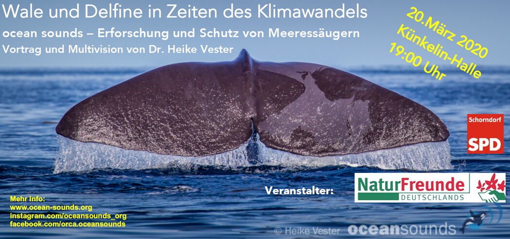 Herzliche Einladung zum Vortrag & Multivision mit der Biologin Dr. Heike Fester - sie erforscht das Leben der Wale und Delfine, ihre Sprache und ihr Sozialverhalten. Diese komplexe Arbeit ist äußerst interessant und wird leider nur von wenigen WissenschaftlierInnen betrieben. Man sieht, wie hoch komplex diese Meeressäuger miteinander leben, wie sie kommunizieren und wie wichtig ihre Erhaltung für die Meere und damit für die gesamte Menscheit ist. In der Zeit des Klimawandels und der Bedrohung sensibler Ökosysteme ist es immer mehr vonnöten, sich zu informieren und damit auseinander zu setzen.