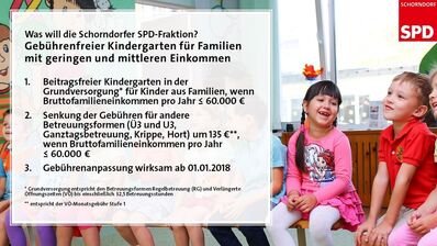 Keine Kindergartengebühr für Familien mit unteren und mittleren Einkommen bis 60.000 € brutto im Jahr. Das war der Antrag der SPD im Gemeinderat. Damit hat die Schorndorfer SPD einen Vorzeichenwechsel vollzogen. Wir wollen nicht mehr länger auf Bund und Land warten, sondern wir wollen auf kommunaler Ebene eine klare Verbesserung für Familien mit kleinen und mittleren Einkommen erreichen.